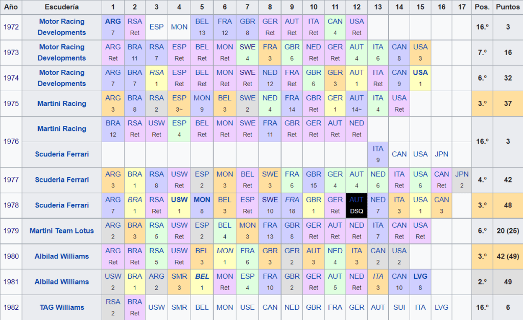 Su palmarés registra 12 victorias, 45 podios y seis pole positions. En 1981 fue segundo por un punto del campeón Nelson Piquet.